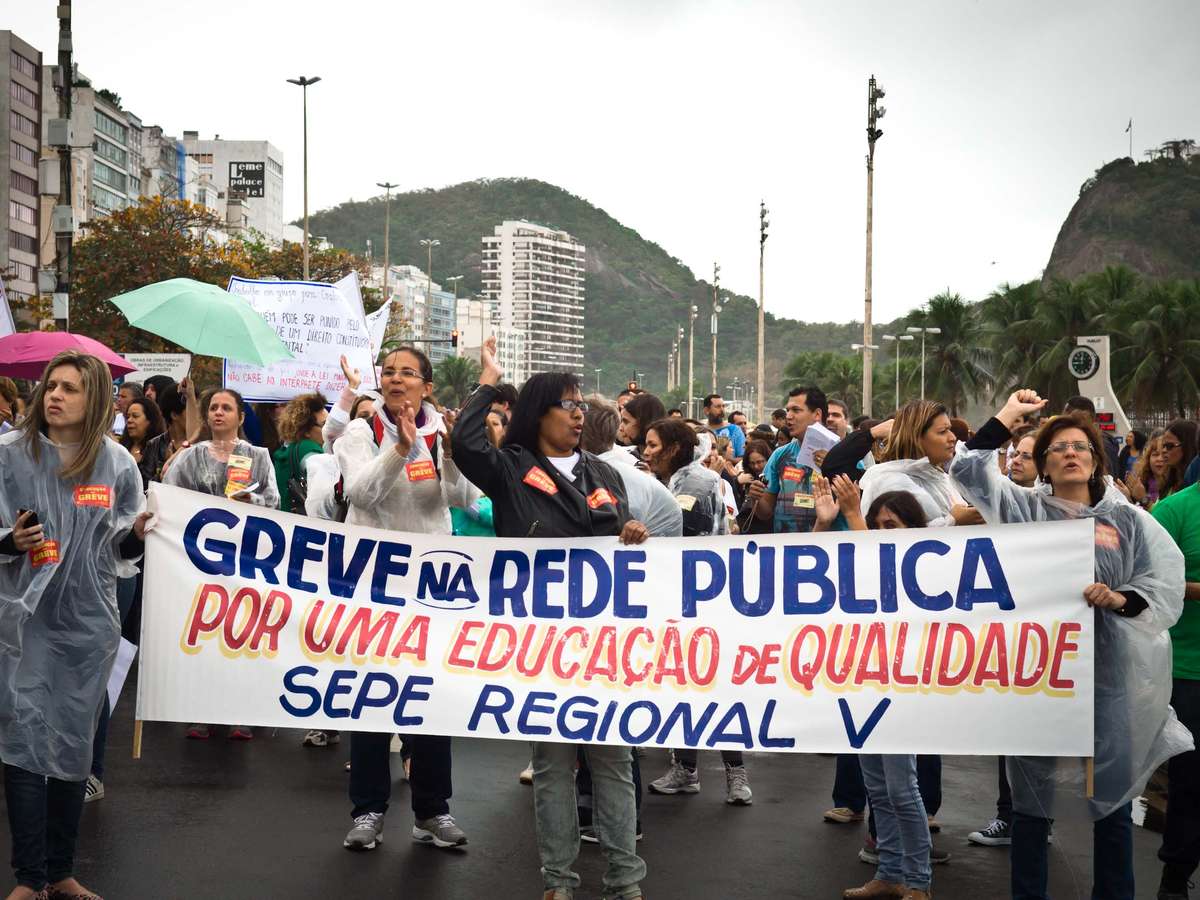 Manifestante exibe cartaz durante protesto de professores no Rio de Janeiro
