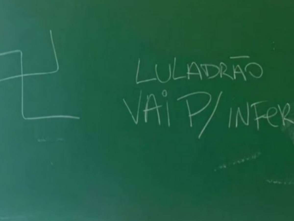 A suástica foi desenhada em giz, ao lado de uma frase ofensiva ao presidente Luiz Inácio Lula da Silva (PT): "Luladrão vai para o inferno".