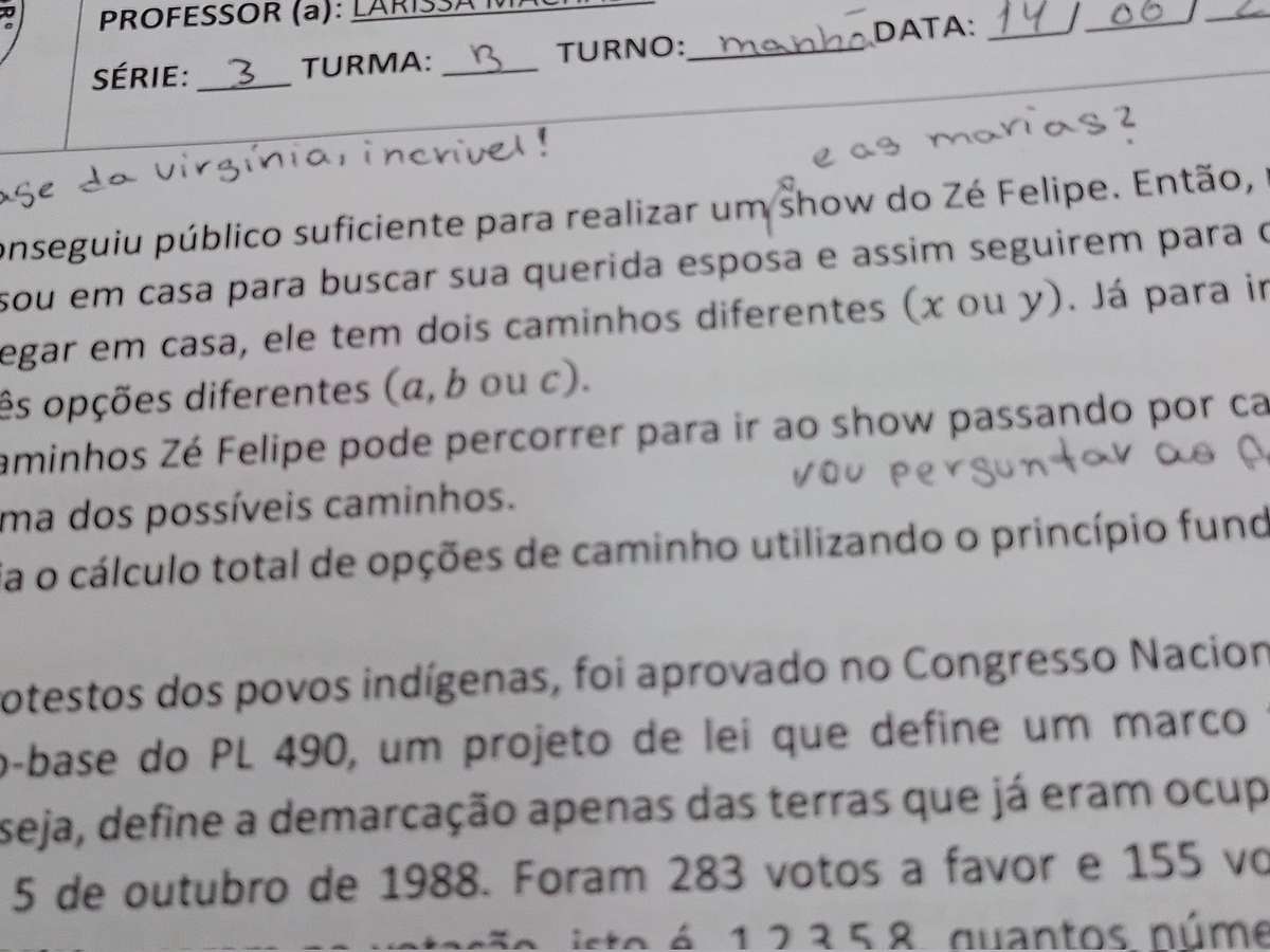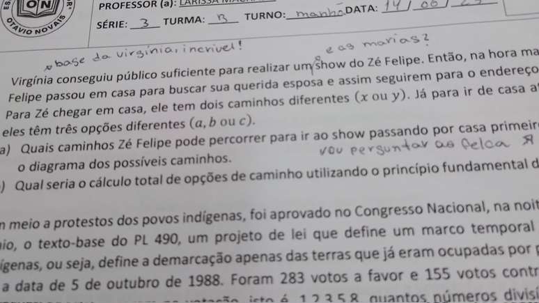 A aluna também escreveu: "E as Marias?", se referindo às filhas do casal. A menina também deixou um comentário dizendo que não sabia resolver a questão, mas que iria perguntar ao Felca, um youtuber.