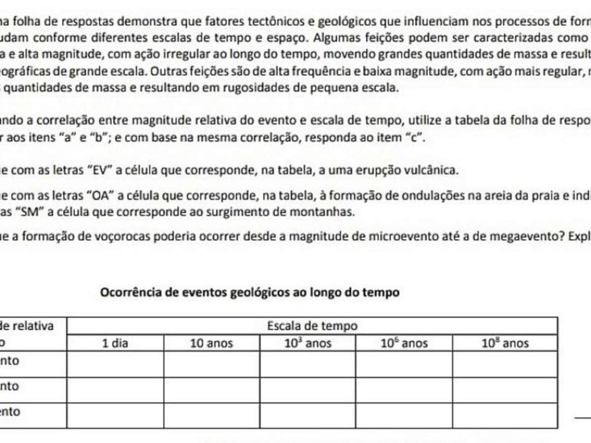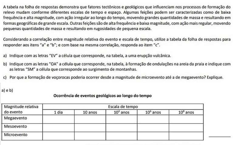 Segundo o Anglo Vestibulares, porém, uma das questões de Geografia deu margem a dúvidas. Trata-se da questão que abordou a influência de fatores tectônicos e geológicos nos processos de formação do relevo. O enunciado pedia para assinalar em uma tabela a ocorrência de uma erupção vulcânica, relacionando-a à escala de tempo e à magnitude do evento. "A erupção vulcânica tem uma frequência que pode variar de dias, meses ou anos. Isso impossibilita assinalar uma das células indicadas no exercício", apontou o cursinho.