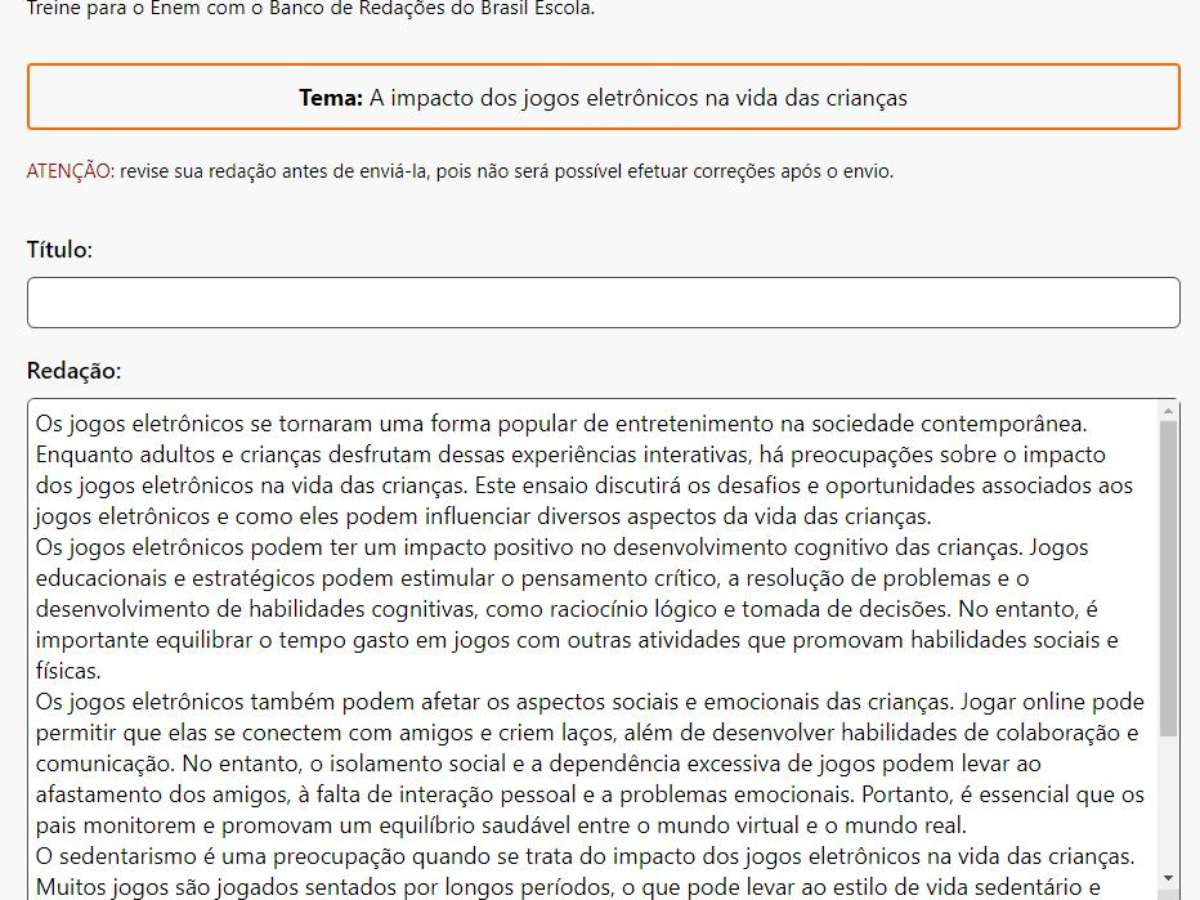 Veja abaixo um exemplo de redação sobre o impacto dos jogos eletrônicos na vida das crianças enviada pelo Banco de Redações e corrigida pela Iara em seguida:
