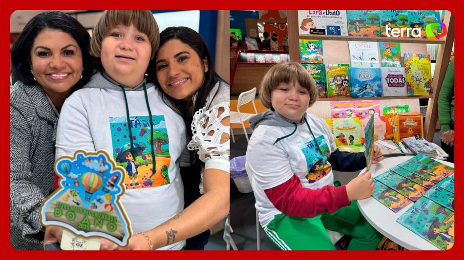 Vittorio Apps, de 10 anos, viajou à Itália para lançar seu sétimo livro, Tá Chovendo Uva. O lançamento ocorreu na Feira do Livro Infantil de Bolonha, na terça-feira, 1º. A história fala sobre uma cidade surpreendida por uma chuva de uvas. O livro é uma homenagem à tia do autor, que também é autista e tem síndrome de Down e microcefalia. Vittorio já recebeu prêmios internacionais por sua produção literária. Imagem: Arquivo pessoal