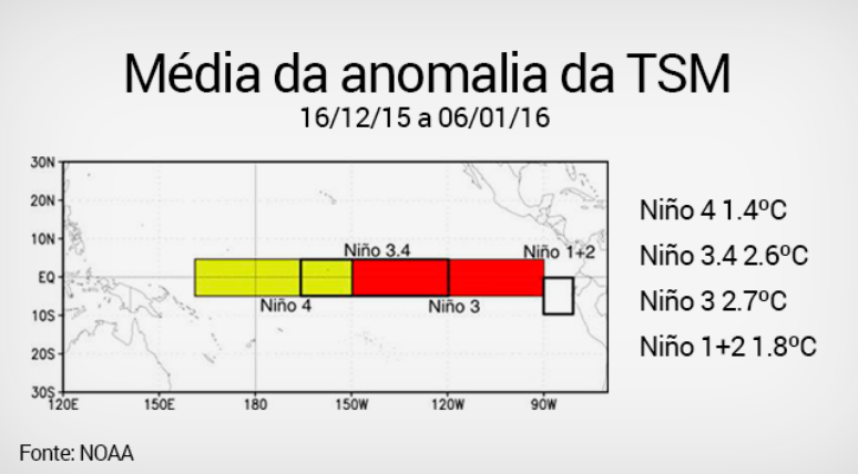 As condições atuais da anomalia da TSM no Pacífico Equatorial indicam a presença do fenômeno El Niño. Segundo a análise da NOAA/EUA, atualizada em 11 de janeiro de 2016, a média da anomalia da TSM no período de 16 de dezembro de 2015 a 6 de janeiro de 2016, a anomalia da TSM na região Niño 3.4 estava positiva e foi de 2,6°C acima da média numa grande área oceânica.