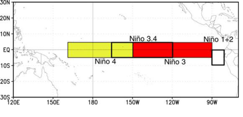 O El Niño é caracterizado por um aquecimento acima do normal das águas do oceano Pacífico Equatorial. A tabela abaixo mostra as regiões determinadas por latitudes e longitudes consideradas usualmente para monitoramento da temperatura do Pacífico Equatorial. A região principal é a Niño 3+4 ou Niño 3.4.