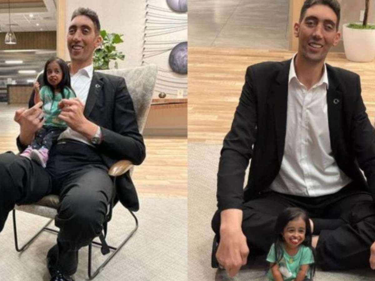 Adorable pictures from the reunion of the duo with the Guinness World Record title for the Tallest Living Man, Sultan Kosen, 41, and the Shortest Living Woman, Jyoti Amge, 30, in California on Monday. 👀