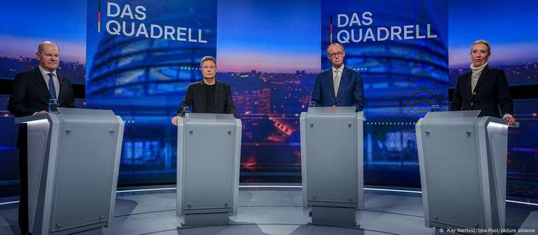 Olaf Scholz (SPD), Friedrich Merz (CDU), Alice Weidel (AfD) e Robert Habeck (Verdes) se enfrentaram em primeiro debate televisionado com os quatro principais candidatos.Os quatro candidatos mais bem colocados nas pesquisas de intenção de voto para o cargo de chanceler federal da Alemanha se enfrentaram neste domingo em um debate televisionado a uma semana da data do pleito, marcado para 23 de fevereiro.