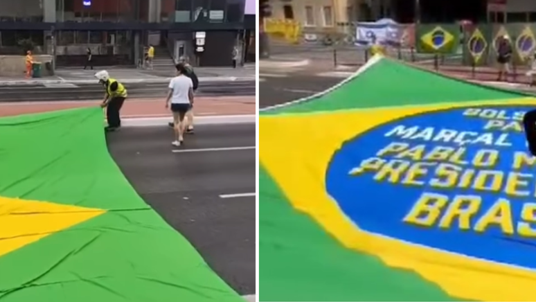 Nesta segunda-feira, 4, o perfil de Pablo Marçal no Instagram compartilhou um vídeo em que a bandeira aparece no chão com um suposto funcionário da Prefeitura de São Paulo mexendo no item, dando passagem a outro homem. Depois, ele sobe em sua moto, já do outro lado da bandeira estirada no chão. Na legenda está escrito que “Funcionários da prefeitura de Nules Bananinha colocaram essa faixa para gerar intriga entre Marçal e Bolsonaro”.