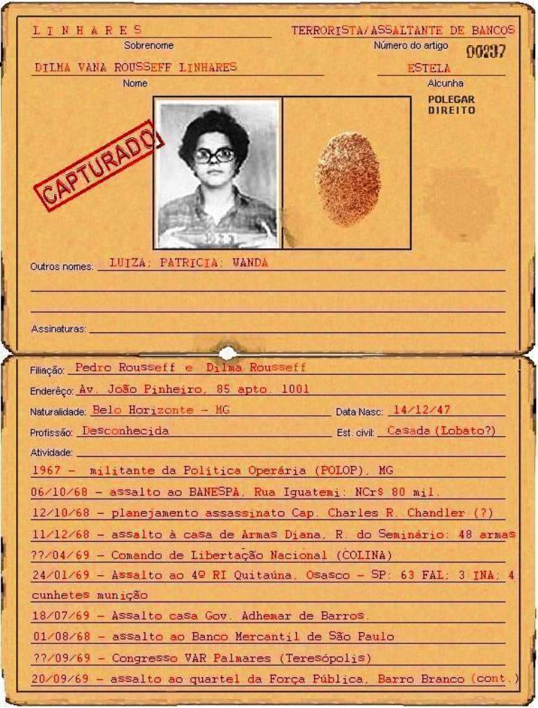 "Solicitei formalmente os documentos sob a guarda do Arquivo Público de São Paulo que dizem respeito a minha pessoa e, em especial, cópia da referida ficha. Na pesquisa, não foi encontrada qualquer ficha com o rol de ações como a publicada na edição de 5.abr.2009. Cabe destacar que os assaltos e ações armadas que constam da ficha veiculada pela Folha de S. Paulo foram de responsabilidade de organizações revolucionárias nas quais não militei. Além disso, elas ocorreram em São Paulo em datas em que eu morava em Belo Horizonte ou no Rio de Janeiro. Ressalte-se que todas essas ações foram objeto de processos judiciais nos quais não fui indiciada e, portanto, não sofri qualquer condenação. Repito, sequer fui interrogada, sob tortura ou não, sobre aqueles fatos. O mais grave é que o jornal Folha de S.Paulo estampou na página A10, acompanhando o texto da reportagem, uma ficha policial falsa sobre mim. Essa falsificação circula pelo menos desde 30 de novembro do ano passado na internet, postada no site www.ternuma.com.br (“terrorismo nunca mais”), atribuindo-me diversas ações que não cometi e pelas quais nunca respondi, nem nos constantes interrogatórios, nem nas sessões de tortura a que fui submetida quando fui presa pela ditadura. Registre-se também que nunca fui denunciada ou processada pelos atos mencionados na ficha falsa."