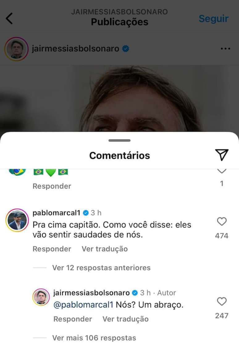 O empresário comentou em uma postagem de Bolsonaro com a frase: "Pra cima capitão. Como você disse: eles vão sentir saudades de nós". Em poucos minutos, Bolsonaro respondeu: "Nós? Um abraço".