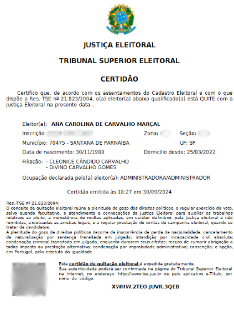Mais cedo, durante o debate desta segunda-feira, 30, Marçal afirmou que a companheira transferiu o seu título, mas, segundo o certificado de quitação eleitoral, emitido pela Justiça Eleitoral e obtido pelo Terra, Ana Carolina continua votando em Santana de Parnaíba. Veja o documento abaixo: