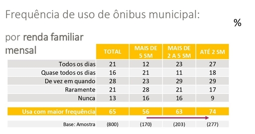 Segundo a pesquisa da Rede Nossa São Paulo, o ônibus municipal é o meio de transporte usado com maior frequência pela população paulistana, e vem aumentando. Quase todos os usuários são das classes D e E.