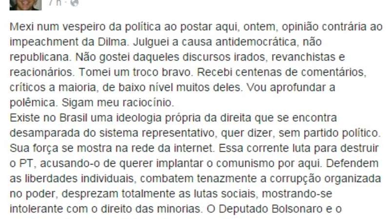 "Mexi num vespeiro da política ao postar aqui, ontem, opinião contrária ao impeachment da Dilma. Julguei a causa antidemocrática, não republicana. Não gostei daqueles discursos irados, revanchistas e reacionários. Tomei um troco bravo. Recebi centenas de comentários, críticos a maioria, de baixo nível muitos deles. Vou aprofundar a polêmica. Sigam meu raciocínio.