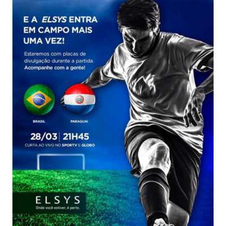 A Elsys, companhia brasileira com tradição no mercado de eletroeletrônicos e telecomunicações, estará presente em mais um jogo da Seleção Brasileira. A empresa terá placa estática na Arena Corinthians, na partida desta terça-feira, 28 de março, contra o Paraguai, que poderá definir a classificação do Brasil para a Copa do Mundo de 2018, na Rússia. A disputa acontecerá às 21h45 em São Paulo, e será exibida ao vivo pela Globo e pelo SporTV.