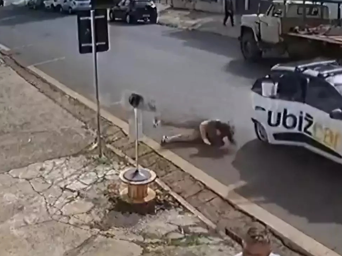 Nas imagens de segurança locais, é possível ver o momento exato em que a mulher abre a porta do carro e se joga para fora. O caso aconteceu na rua Domingos José Vieira e após cair no chão, a vítima se levanta e sai andando rapidamente.