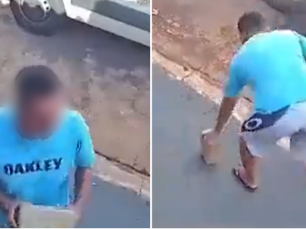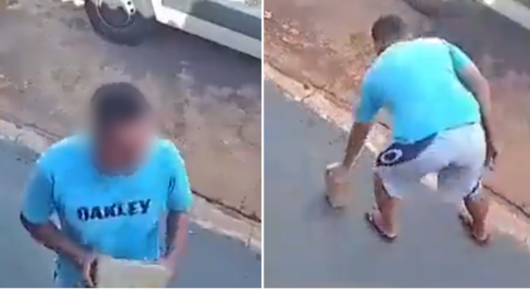 Imagens registradas pela câmera de segurança do cliente mostram o momento em que o homem arremesa o pacote contra o chão