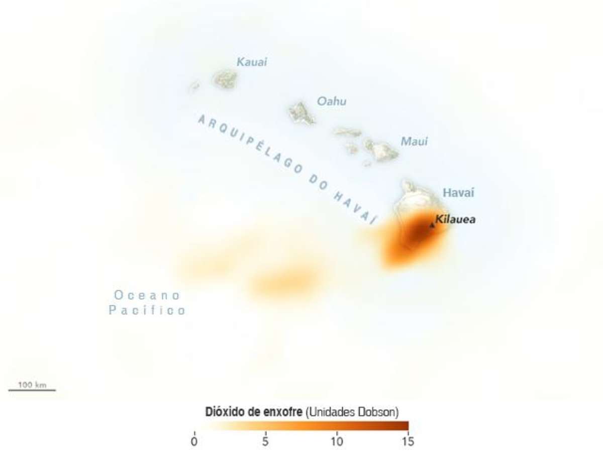 A pluma vulcânica liberada pelo Kilauea continha dióxido de enxofre (SO2), um gás que foi detectado pelo Ozone Mapper Profiler Suite (OMPS) no satélite Suomi-NPP da NASA.