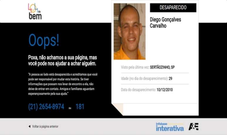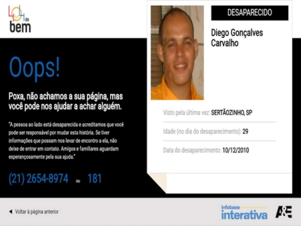 Ao clicar em uma página inexistente, o usuário é impactado pela mensagem: Poxa, não achamos a sua página, mas você pode nos ajudar a achar alguém. A pessoa ao lado está desaparecida e acreditamos que você pode ser responsável por mudar esta história. Se tiver informações que possam nos levar de encontro a ela, não deixe de entrar em contato. Amigos e familiares aguardam esperançosamente pela sua ajuda.