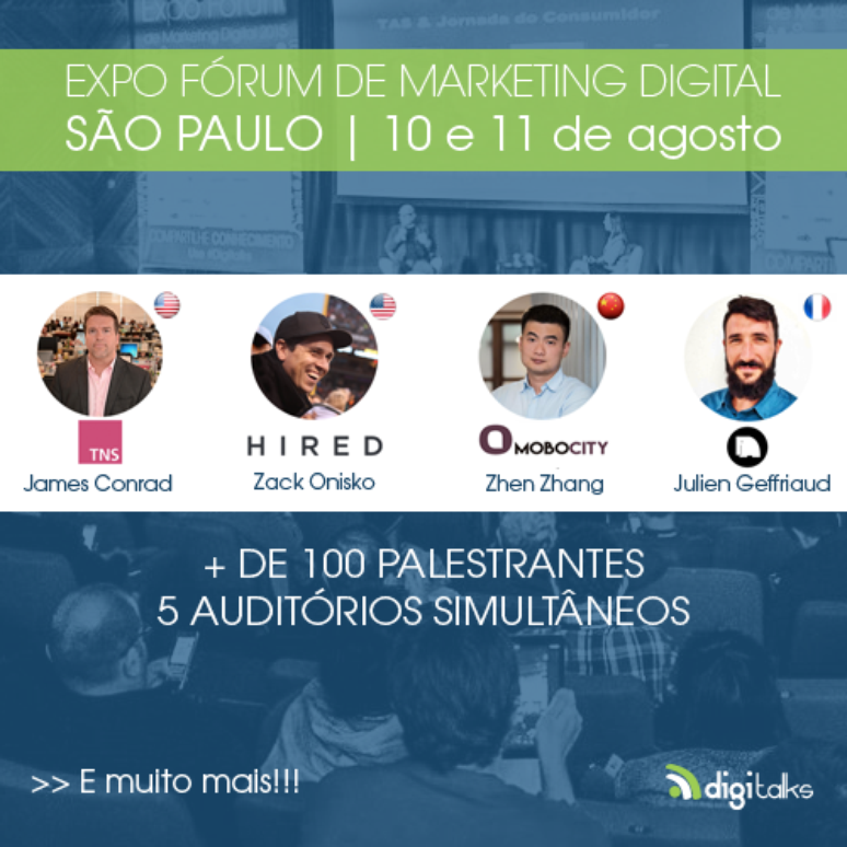 Nos dias 10 e 11 de agosto, acontece o Expo Fórum de Marketing Digital, na Fecomercio, em São Paulo. Trata-se do principal evento do setor no país, com mais de 100 palestrantes, que se dividem entre o congresso internacional e os seminários temáticos, que acontecem em 5 palcos diferenciados, além da área de exposição e negócios.