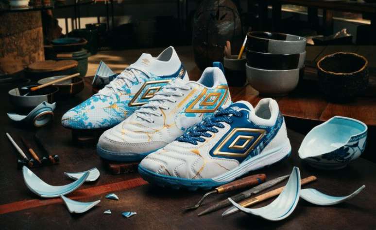 A arte do Kintsugi defende que fissuras e rachaduras não devem ser escondidas, mas valorizadas, já que cada reparo carrega história e beleza. A Umbro explica que, no futebol, essas marcas aparecem em derrotas, lesões e desafios, e é justamente elas que moldam o jogador. O Kintsugi Pack transforma então cada chuteira em um objeto simbólico, que honra o processo de superação.