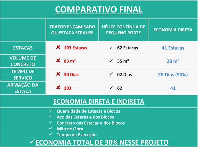 O resultado mais expressivo deste comparativo é a economia de tempo. Para a execução da solução em estaca de Hélice Continua é previsto 02 dias para executar o projeto. No caso de utilizar as soluções de estaca Strauss ao trator encamisado é previsto 30 dias para executar o projeto. Uma diferença de 90% em tempo gasto na obra entre as soluções comparadas.
