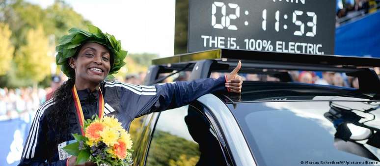 Tigst Assefa disse que buscava quebrar o recorde, mas se surpreendeu por ter ficado mais de dois minutos abaixo da marca anterior. Entre os homens, Eliud Kipchoge venceu pela quinta vez na capital alemã.Tigst Assefa, da Etiópia, quebrou o recorde mundial da maratona feminina em Berlim neste domingo (24/09), reduzindo em mais de dois minutos o recorde anterior ao concluir os 42 quilômetros da corrida em 2 horas, 11 minutos e 53 segundos.