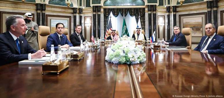 Países decidem em Riad criar caminho para acabar com a guerra na Ucrânia e melhorar relações diplomáticas e econômicas. Reunião ocorre sem representantes ucranianos e de países europeus.Os Estados Unidos e a Rússia concordaram em nomear equipes para negociar o fim da guerra na Ucrânia e em começar a trabalhar para melhorar seus laços diplomáticos e econômicos durante uma reunião na Arábia Saudita entre o ministro do Exterior da Rússia, Serguei Lavrov, e o secretário de Estado dos EUA, Marco Rubio, nesta terça-feira (18/02).