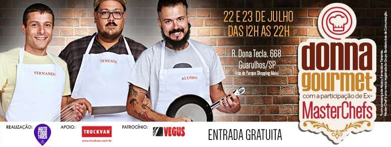 Juntos os chefs integram o projeto Gangue Erva Doce, especializado em gastronomia para eventos e, no Donna Gourmet, o trio servirá hambúrgueres artesanais e churrasco. Também será possível tirar fotos com eles em um espaço interativo que será montado no local. Além disso, estarão presentes diversos food trucks com as mais variadas opções de doces, salgados e muita comida boa. Para tornar o ambiente ainda mais agradável, as crianças poderão se divertir com atividades exclusivas e divertidas.