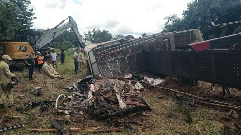 Segundo a Polícia Militar, o caminhoneiro afirmou, na ocasião, que não percebeu a presença do carro embaixo da carga espalhada. Ele sofreu ferimentos e foi hospitalizado após o tombamento do veículo.