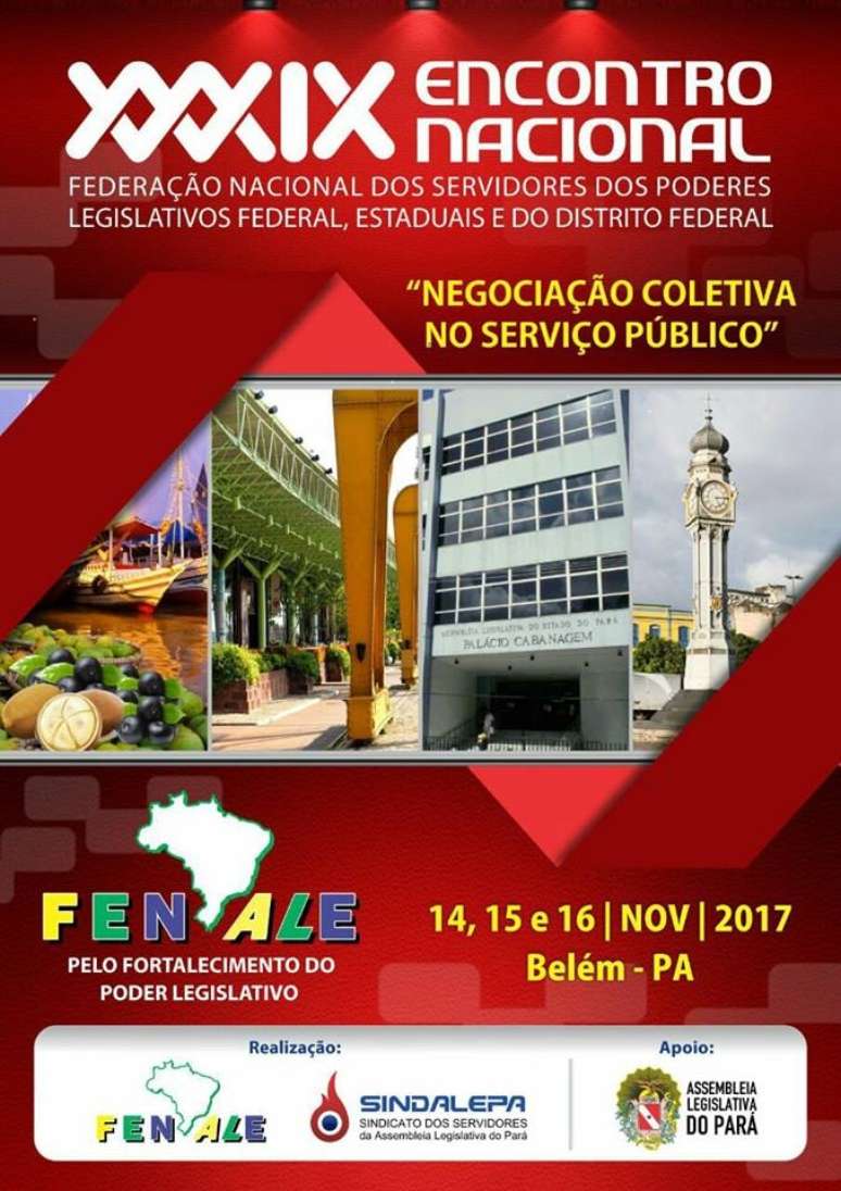 A Federação Nacional dos Servidores dos Poderes Legislativos Federal, Estaduais e do Distrito Federal - Fenale, presidida por João Moreira (MS), realizará seu XXXIX Encontro Nacional, de 14 a 16 de novembro, em Belém do Pará.