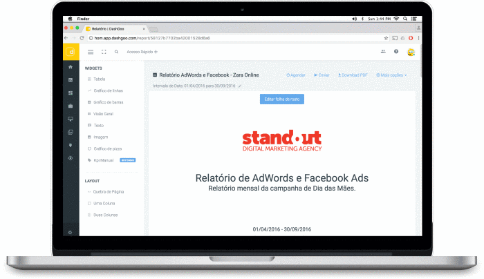 Os relatórios podem ser criados gratuitamente por um período de 14 dias em https://dashgoo.com