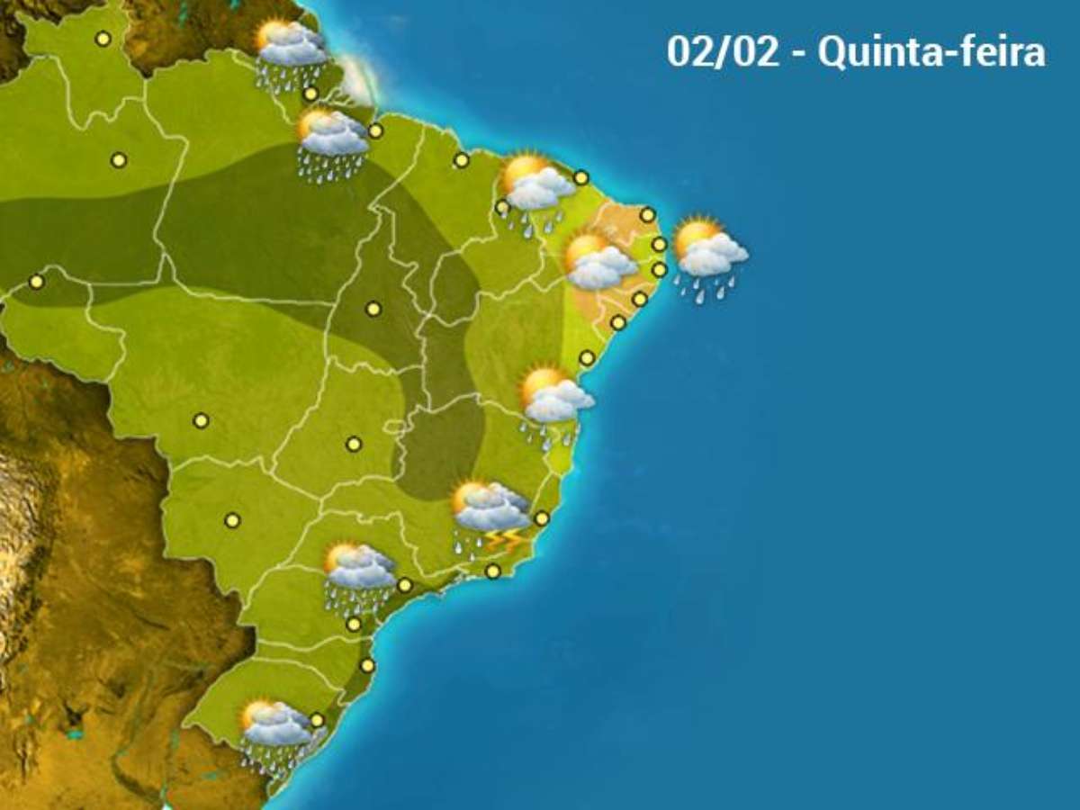Do Ceará ao litoral do Amapá, o tempo fica instável neste 2 de fevereiro, com muitas nuvens e pancadas de chuva a qualquer hora que podem vir com raios.