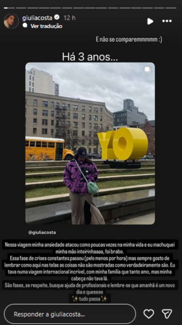 A viagem citada por Giulia aconteceu há três anos. “Nessa viagem minha ansiedade atacou como poucas vezes na minha vida e eu machuquei minha mão inteirinha”, disse a atriz.