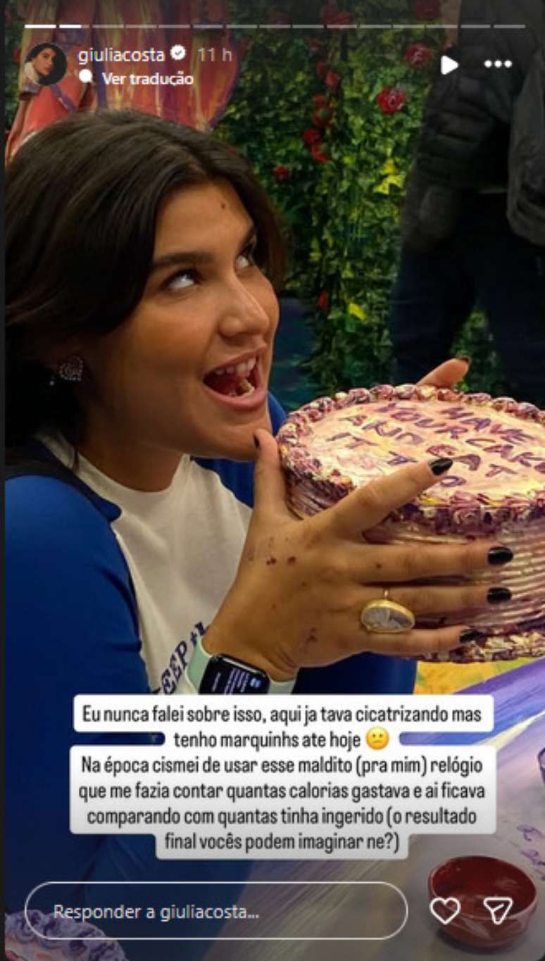 Ela explica que na época usava um relógio para contar quantas calorias gastava, e que isso a fazia ficar comparando o valor com o quanto ela ingeria. “O resultado final vocês podem imaginar, né”, finalizou, dando a entender que esta situação se tornou um gatilho para sua ansiedade.