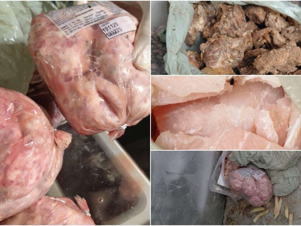 Os agentes apontaram situações críticas, entre elas freezers com carnes, frangos e peixes em processo de degelo armazenados de forma inadequada e misturados entre si, além de acumulação de sangue nos equipamentos, o que configura risco de contaminação cruzada. Foram encontrados queijos expostos sem identificação, preparações prontas mantidas sem controle de temperatura e a presença de moscas em áreas de armazenamento e sobre os alimentos.