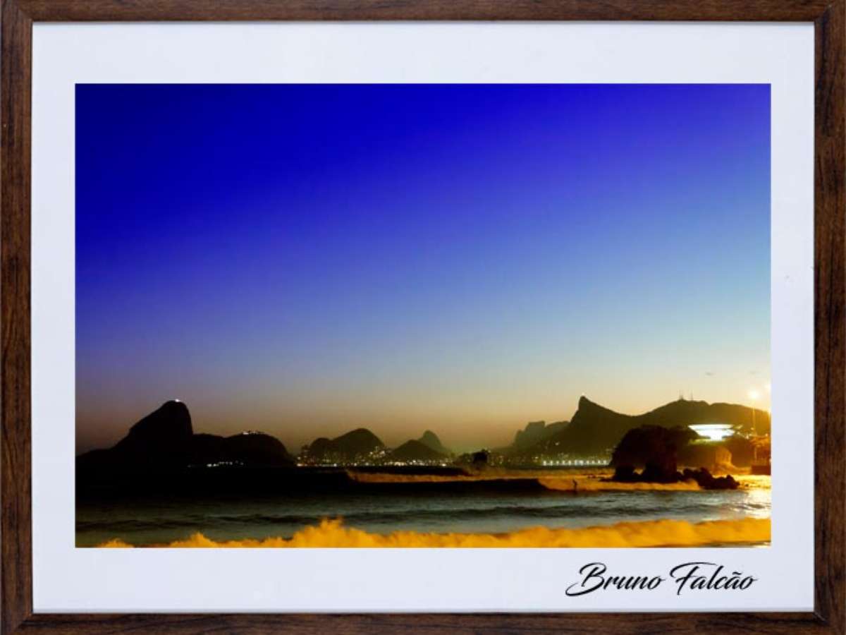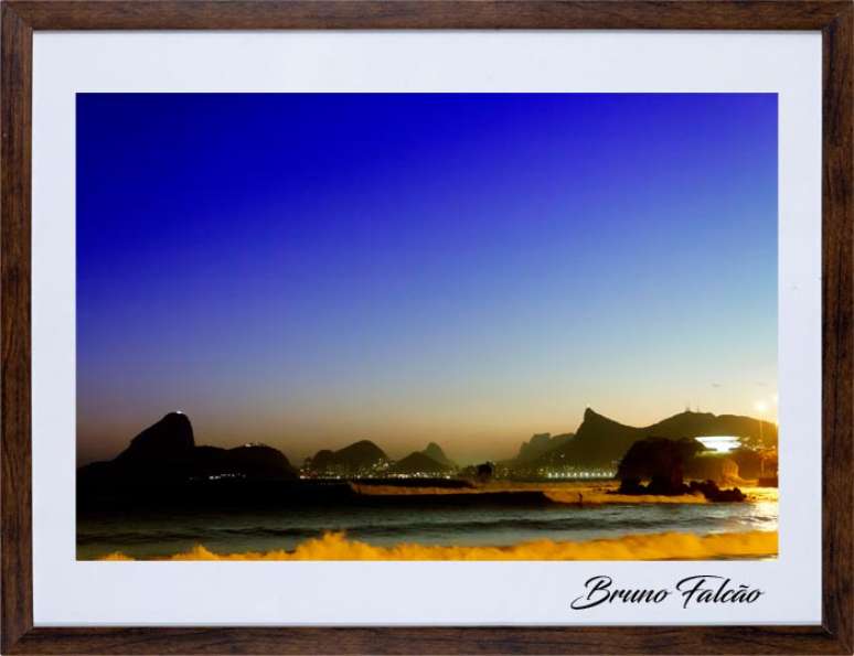 Mas quase não consegui fazer a foto, no inverno a luz cai muito rápido e o Cristo Redentor demora muito a acender os holofotes, enquanto ele estava apagado entraram algumas séries com ondas, a luz baixando a noite chegando e quando ele acendeu o mar deu uma acalmada e as ondas pararam, fiquei ali no pé do Cristo rezando para entrar uma série grande a tempo pois já estava praticamente noite, no último fio de luz `as 18:38 elas entraram, perfeitas para o ângulo que eu estava, com bom tamanho, eram as séries que tinha visto no gráfico chegando e na hora certa, no último fio de luz do dia, foi preciso experiência pois já estava muito escuro, dependendo da velocidade do click se fosse um pouco mais rápido as ondas não iam aparecer e o mar ia ficar todo preto, se fosse um pouco mais lento as ondas e os surfistas iam borrar e a luz do museu que era muito mais forte que as outras estourar, mas finalmente consegui cumprir meu objetivo, terminei minha série de fotografias fine art com os line ups dos melhores picos para prática do surf no Rio de Janeiro que estão em exposição no Instagram @brunofalcaorj.