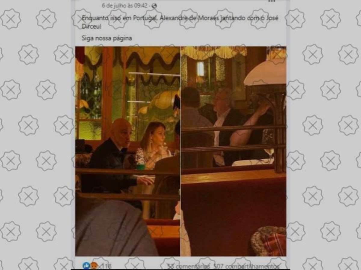 É falso que o ministro do STF (Supremo Tribunal Federal) Alexandre de Moraes foi fotografado em jantar com José Dirceu (PT), ex-ministro da Casa Civil do governo de Luiz Inácio Lula da Silva (PT), em Portugal, como afirmam postagens (veja aqui). O homem que aparece em uma das imagens destacadas é o também ministro Ricardo Lewandowski, não Dirceu. Não há registros de que Moraes e o petista tenham se encontrado em jantar recentemente.