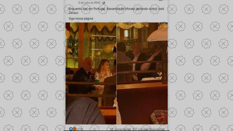 Postagens que circulam nas redes sociais enganam ao afirmar que fotos mostram o ministro do STF Alexandre de Moraes em jantar com José Dirceu, ex-ministro da Casa Civil da gestão de Lula, em Portugal. A corte afirma que o homem de cabelos brancos que aparece em uma das imagens disseminadas é o ministro Ricardo Lewandowski. Já o advogado de Dirceu, Roberto Podval, diz que o petista não esteve em Portugal recentemente nem se encontrou com Moraes em outro lugar.