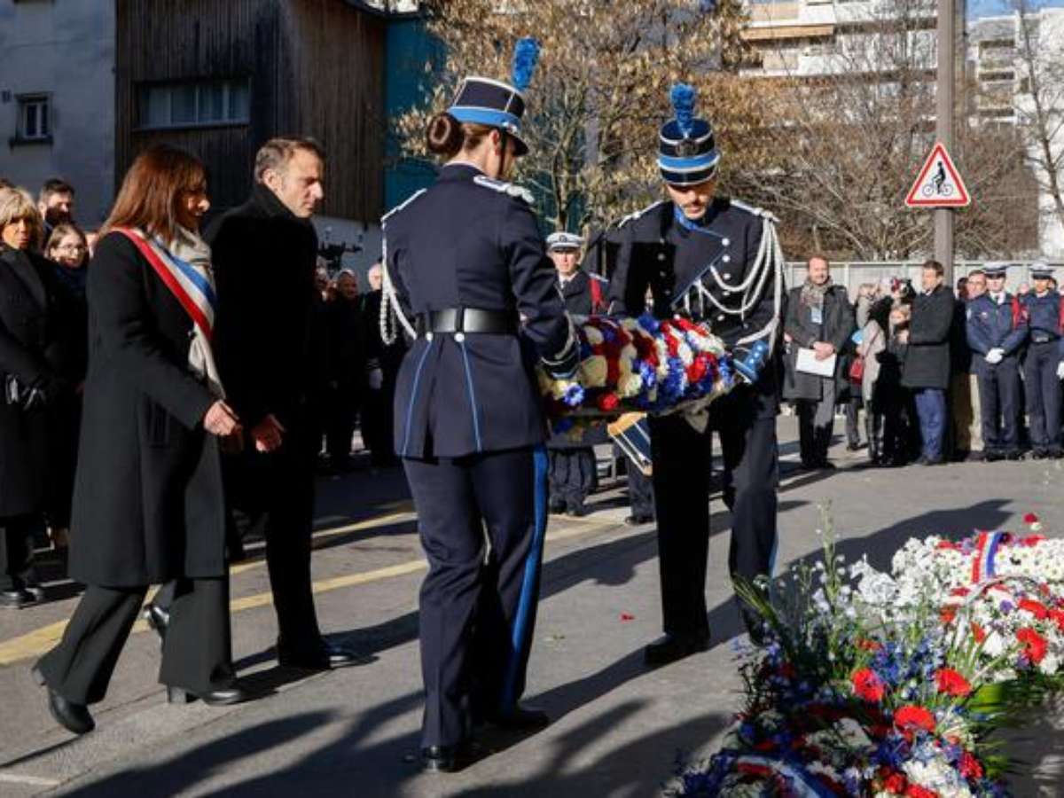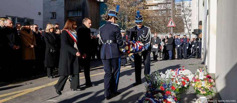 Macron e Hidalgo depositaram juntos flores em frente à antiga sede do jornal satírico, antes de fazerem um minuto de silêncio. Em seguida, La Marseillaise, o hino nacional francês, foi tocado.