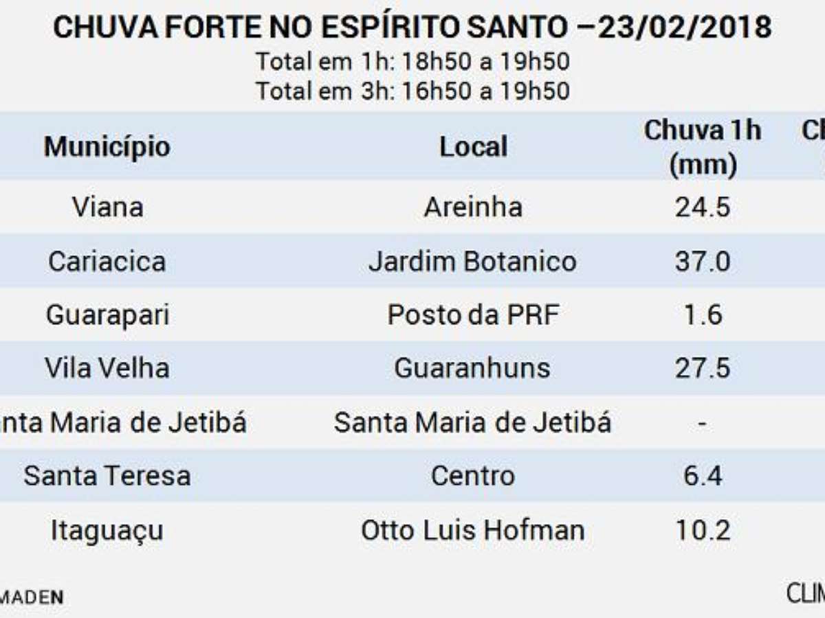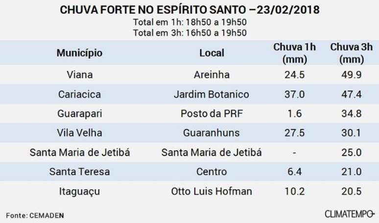 As áreas de instabilidade que se desenvolveram sobre o norte capixaba e também sobre a Grande Vitória provocaram fortes pancadas de chuva. Pela medição do Instituto Nacional de Meteorologia, choveu 21,4 mm em Vila Velha entre 17 e 20 horas e em Alfredo Chaves choveu 32,4 mm entre 16 e 20 horas. Já o CEMADEN - Centro Nacional de Monitoramento e Alertas de Desastres Naturais registrou 37,0 mm em apenas 1 hora de chuva em áreas de Cariacica, na Grande Vitória.