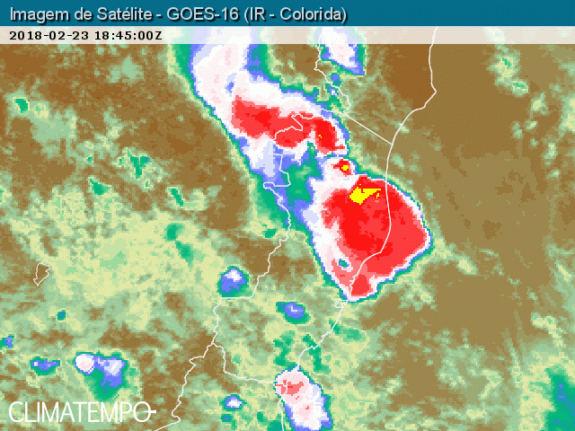 As imagens captadas pelo satélite meteorológico GOES 16 mostram a evolução das nuvens carregadas sobre o Espírito Santo. As manchadas vermelhas e amarelas representam as nuvens com maior potencial para tempestades.