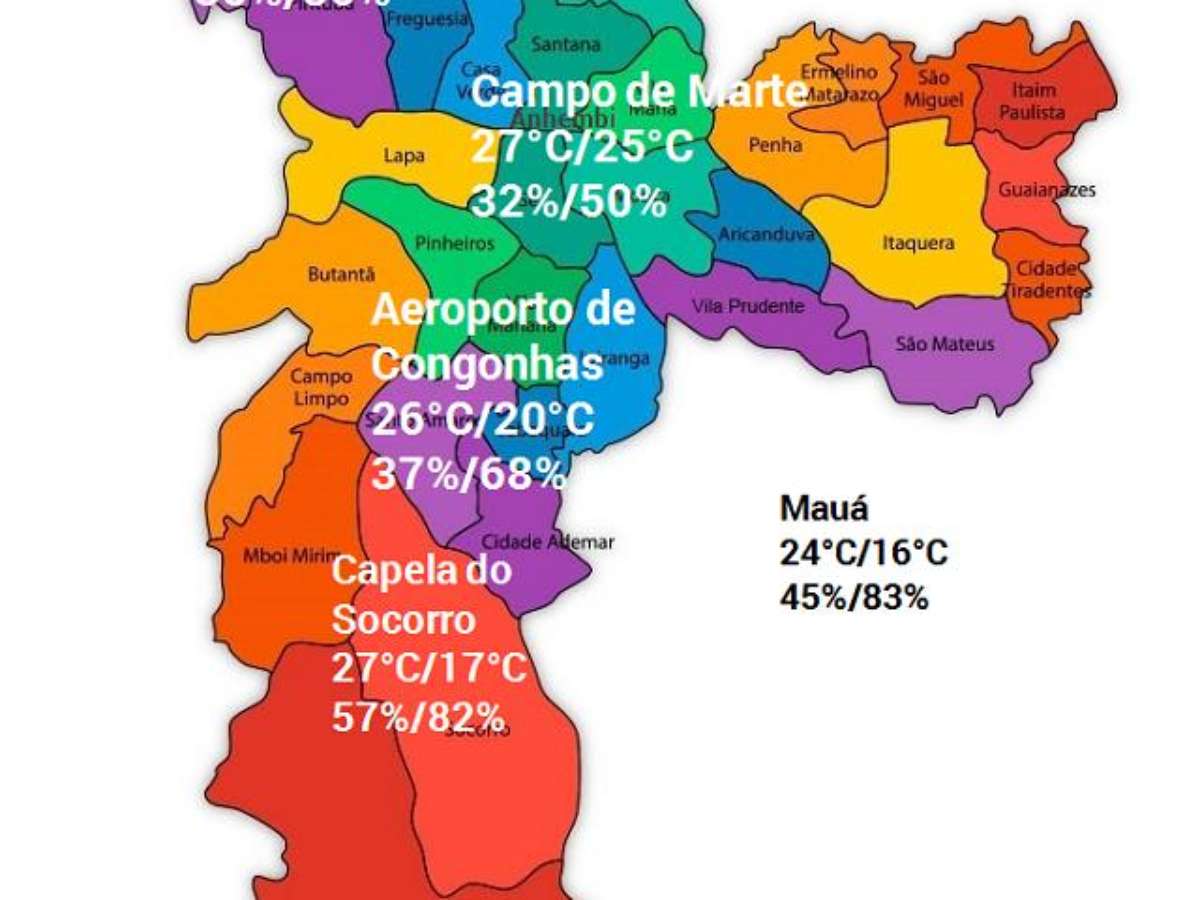 Entre o meio-dia e 15 horas, a temperatura caiu 6°C na região do aeroporto de Congonhas, na zona sul da cidade de São Paulo. Por volta do meio-dia, a temperatura por lá era de 26°C, com umidade relativa do ar de 37%, e às 15 horas, a temperatura baixou para 20°C e a umidade no ar subiu para 68%.