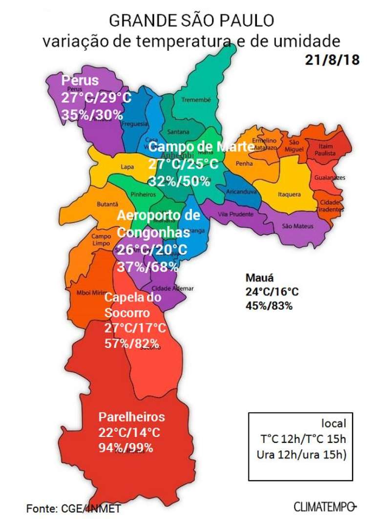 Temperatura e umidade relativa do ar na Grande São Paulo em 21/8/18