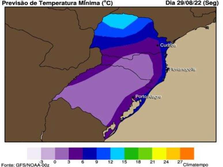 Previsão de temperatura mínima para a segunda-feira, 29 de agosto.