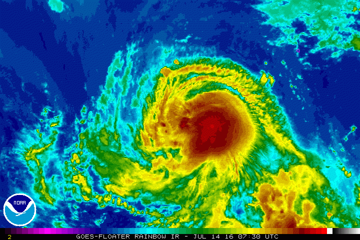 Na análise das 15 UTC (12 horas em Brasília) de 14 de julho do Centro Nacional de Furacões dos Estados Unidos (NHC, na sigla em inglês), Darby estava 1070 quilômetros a sudoeste do sul da Baixa Califórnia. A pressão mínima no seu centro era de 989 hPa e seus ventos constantes eram estimados em 130 km/h, com rajadas maiores. O furacão se deslocava para oeste com velocidade de 20 km/h.