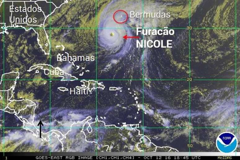 Na análise das 21:00 UTC (18 horas em Brasília) de 12 de outubro do Centro Nacional de Furacões dos Estados Unidos (NHC, em inglês), o furacão Nicole gerava ventos constantes de 175 km/h, com rajadas mais intensas da ordem de 200 km/h. Seu olho estava a 385 km ao sul/sudoeste das Bermudas e a pressão atmosférica mínima de sua baixa pressão era de 969 hPa.