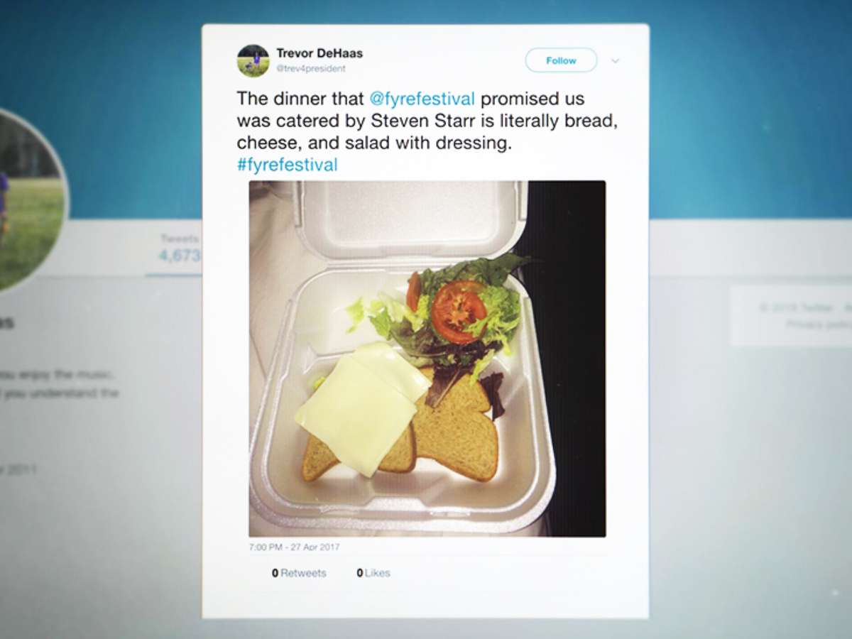 Em vez disso, os participantes encontraram tendas de acampamento, com colchões colocados no chão encharcado pela chuva, e refeições que se limitavam a sanduíches com duas fatias de queijo, alface e tomate. Suas malas foram jogadas em um estacionamento sem iluminação.