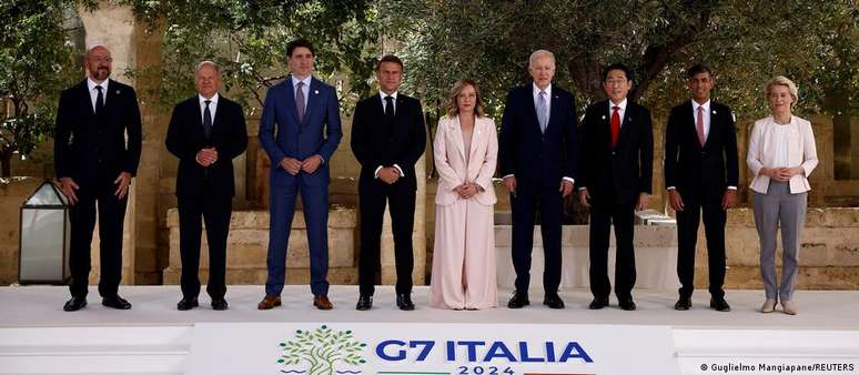 Os presidentes dos Estados Unidos, Joe Biden, e da França, Emmanuel Macron, assim como os primeiros-ministros do Canadá (Justin Trudeau), do Reino Unido (Rishi Sunak), do Japão (Fumio Kishida) e o chanceler federal da Alemanha (Olaf Scholz) foram recebidos para a cúpula anual do G7 pela anfitriã do encontro, a premiê italiana,Giorgia Meloni, em Borgo Egnazia, um resort de luxo no sul da Itália
