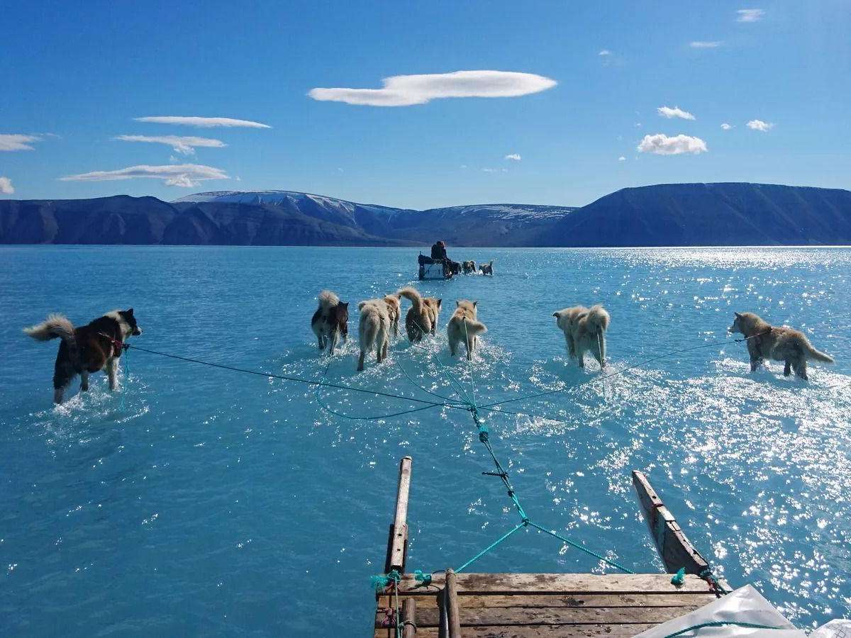 Os cachorros, na verdade, estavam caminhando em meio a uma camada de água derretida, da altura de um tornozelo humano, sobre o gelo marinho em Inglefield Bredning, um sistema de 80 km de comprimento no noroeste da Groenlândia.