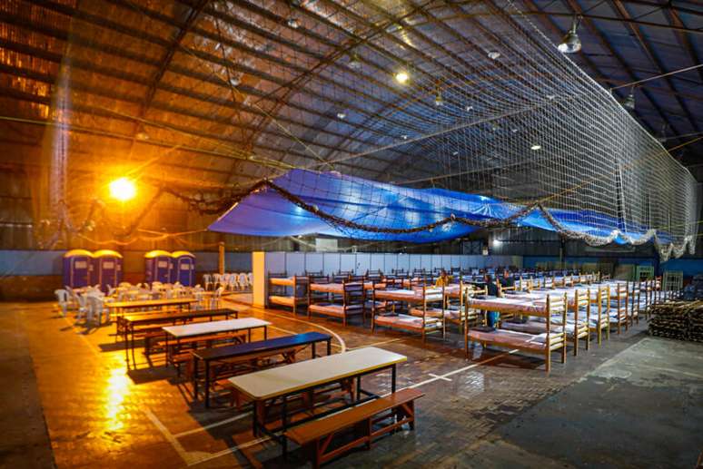Com acesso espontâneo a partir das 19h, o ginásio está estruturado com beliches e disponibiliza kits higiene, agasalhos e alimentação para quem necessitar