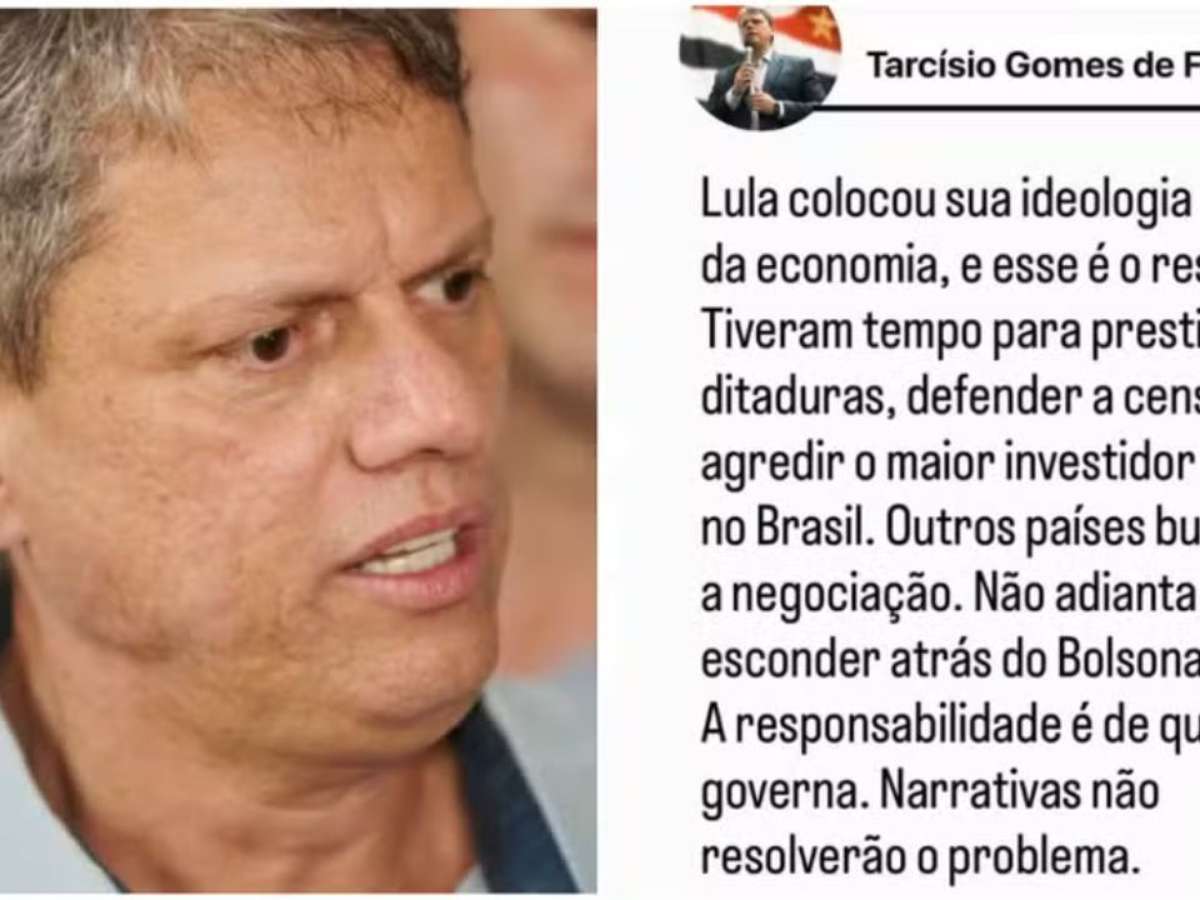 O governador de São Paulo, Tarcísio Gomes de Freitas (Republicanos), culpou o governo de Luiz Inácio Lula da Silva (PT) pela tarifa de 50% sobre produtos brasileiros anunciada pelo presidente dos EUA, Donald Trump.